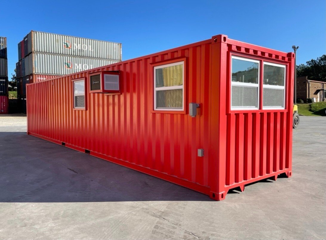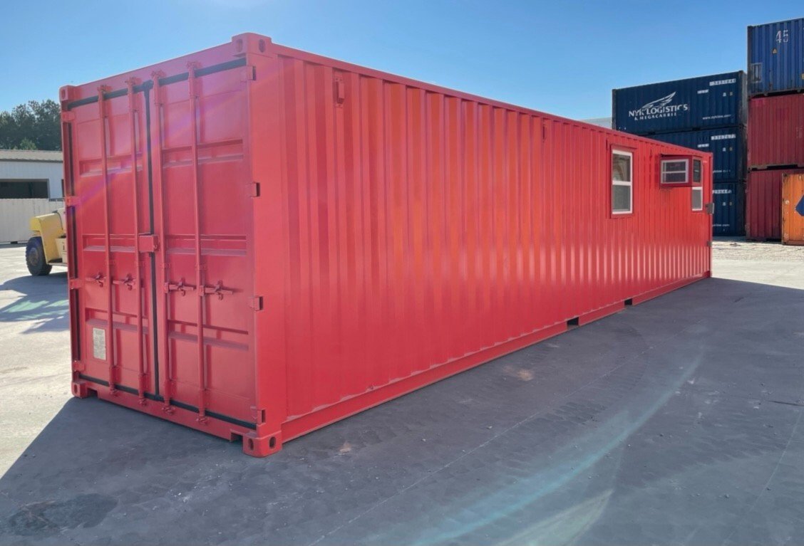 This 40FT modified shipping container office offers 800 sq ft of functional space, perfect for commercial or industrial use. It features a bold red exterior and includes a bathroom, storage space, and a skylight for natural lighting.